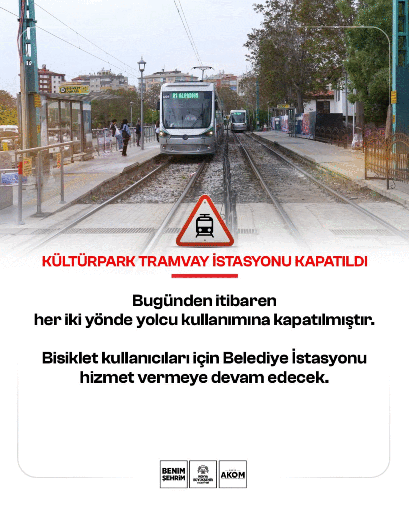 Konya’da toplu taşıma kullanıcılarını yakından ilgilendiren önemli bir gelişme yaşandı. Selçuk Üniversitesi – Kampüs – Alaaddin tramvay hattı üzerinde bulunan Kültürpark Tramvay Durağı, 30 Temmuz 2025 Çarşamba günü itibarıyla kalıcı olarak yolcu kullanımına kapatıldı. Bu karar, Konya AKOM (Afet Koordinasyon Merkezi) tarafından yapılan resmi açıklamayla duyuruldu.